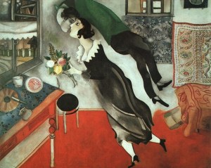 Chagall, judío ruso emigrado a París, no siguió nunca las consignas de las vanguardias y se mantuvo fiel a un estilo y una temática impregnados a un tiempo de religiosidad y sincera celebración del mundo. Su amor eterno por su esposa Bella, le inspira obras inolvidables como Cumpleaños.