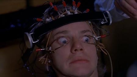 Condicionamiento del protagonista. Fotograma de La naranja mecánica. A partir de los años cincuenta, Ewen Cameron (Presidente de la Asociación Americana de Psiquiatría, de la Asociación Canadiense de Psiquiatría y de la Asociación Mundial de Psiquiatría) se había apartado del enfoque estándar freudiana, la «terapia conversacional«, que se empleba para deducir las «causas arraigadas» de las enfermedades mentales de los pacientes. Su ambición era recrear la mente de sus pacientes, en lugar de curarles o arreglar lo que fuera disfuncional, y para ello utilizaba un método de su invención, llamado «impulso psíquico».Según sus publicaciones de la época, Cameron creía que la única forma de enseñar a sus pacientes a comportarse de forma sana y estable era meterse dentro de sus mentes y «quebrar las viejas pautas y modelos de comportamiento patológico». El primer paso consistía en «erradicar las pautas», cuyo objetivo era asombroso: devolver la mente al estado en que Aristóteles describió como «una tabla vacía sobre la cual aún no hay nada escrito», una tabula rasa. Cameron creía que se podía alcanzar dicho estado atacando el cerebro con todos los elementos que interfieren en su funcionamiento normal. Todos a la vez. Eran las tácticas militares de «shock y conmoción» desplegadas en el campo de batalla de la mente humana.