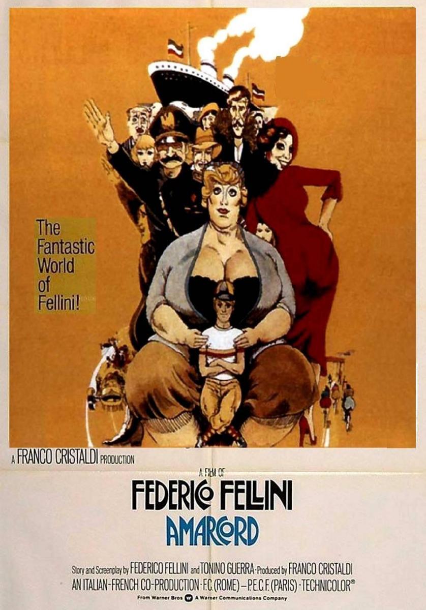 Fellini deja de fotografiar la realidad para deformarla incorporando elementos surrealistas y autobiográficos. A esta época pertenecen tanto Fellini ocho y medio (1963) como Roma (1972), ambas sátiras de su ciudad adoptiva y su ambiente profesional. En Amarcord (1973), su mejor película, Fellini regresa a la adolescencia en su Rímini natal.