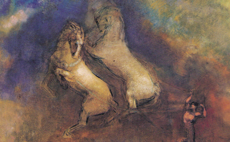 SÓC. – Cómo es el alma, requeriría toda una larga y divina explicación; pero decir a qué se parece, es ya asunto humano y, por supuesto, más breve. Podríamos entonces decir que se parece a una fuerza que, como si hubieran nacido juntos, lleva a una yunta alada y a su auriga. Pues bien, los caballos y los aurigas de los dioses son todos ellos buenos, y buena su casta, la de los otros es mezclada. Por lo que a nosotros se refiere, hay, en primer lugar, un conductor que guía un tronco de caballos y, después, estos caballos de los cuales uno es bueno y hermoso, y está hecho de esos mismos elementos, y el otro de todo lo contrario, como también su origen. Necesariamente, pues, nos resultará difícil y duro su manejo (…)