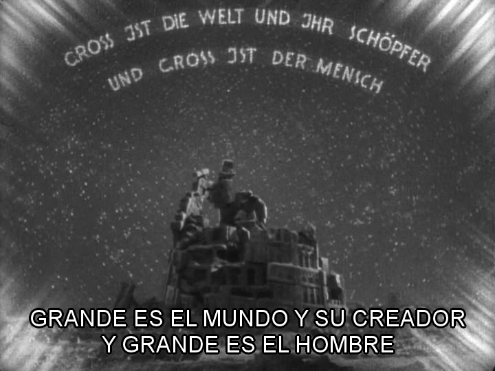 7. La parábola de la Torre de Babel tal y como la cuenta María es muy diferente de la versión del Antiguo Testamento. En el Antiguo Testamento Dios castiga la soberbia de los hombres, mientras que en la versión de María son los trabajadores oprimidos los que destruyen la obra de la élite dominante. El capitalismo y el progreso científico simbolizados por la gigantesca torre son la causa de la catástrofe pues engendran la lucha de clases. El mensaje final es claro. Sólo hay dos opciones posibles: o el fascismo, una mezcla de capitalismo y exaltación de la nación, la heimat, o el apocalipsis de la revolución obrera.