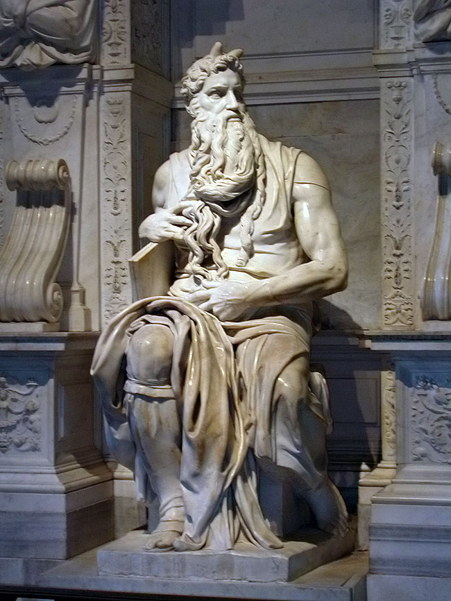 Miguel Ángel tiene más éxito en su lucha contra la Naturaleza. Su exaltación de la figura masculina alcanza su clímax en el David y, sobre todo, en su Moisés.