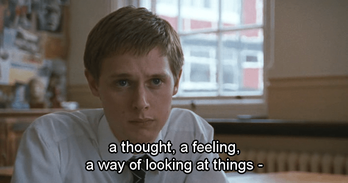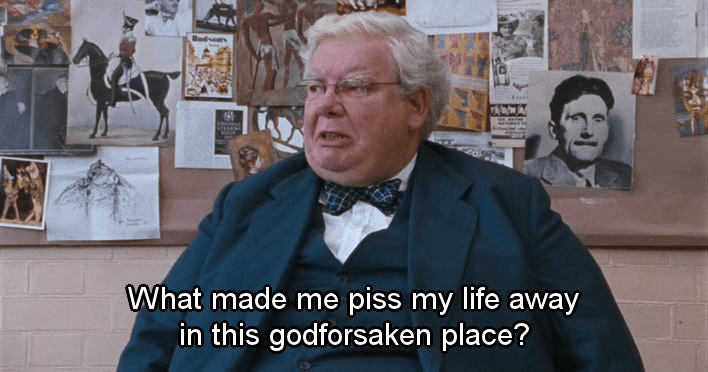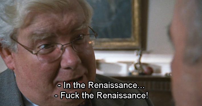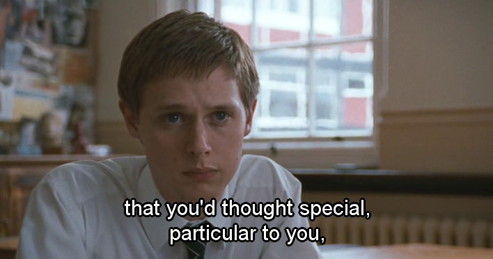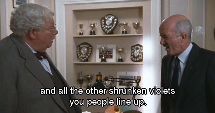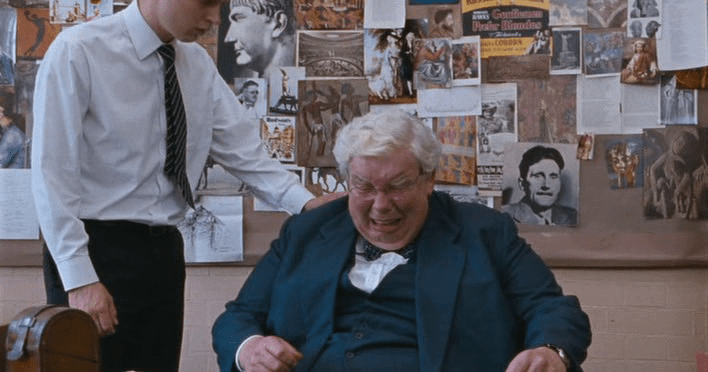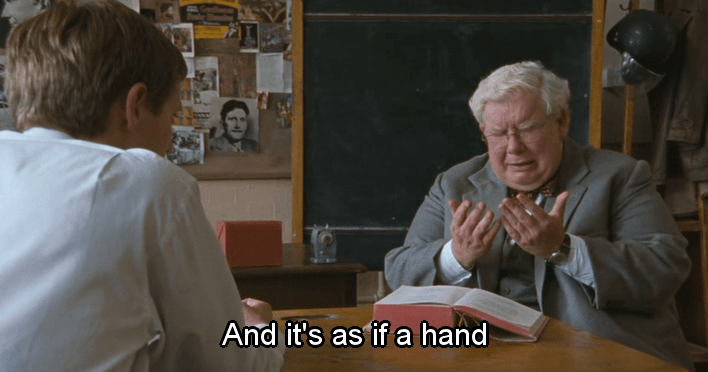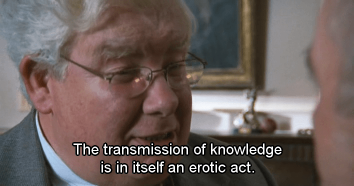 Los devaneos homosexuales del personaje interpretado por Robert Griffiths le cuestan el puesto de trabajo. La alusión a la importancia del eros platónico en el proceso del conocimiento es otra referencia filosófica reseñable. La bronca del director, como la vida misma: