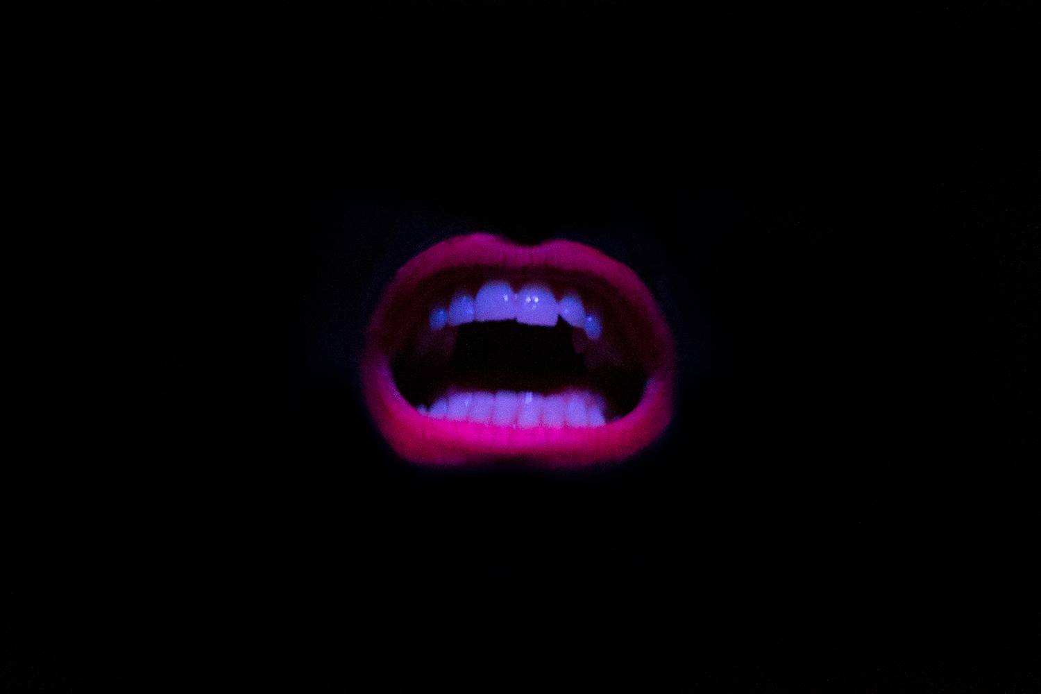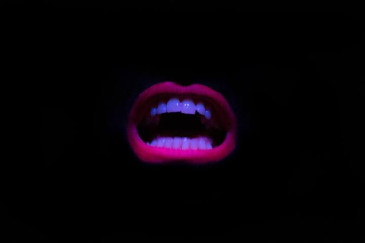 Stage in darkness but for MOUTH, upstage audience right, about 8 feet above stage level, faintly lit from close-up and below, rest of face in shadow. Invisible microphone.