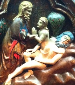 Catedral de Santo Domingo de La Calzada. Yahvé arranca a Eva del vientre de Adán. Menos mal que lo hizo con anestesia.