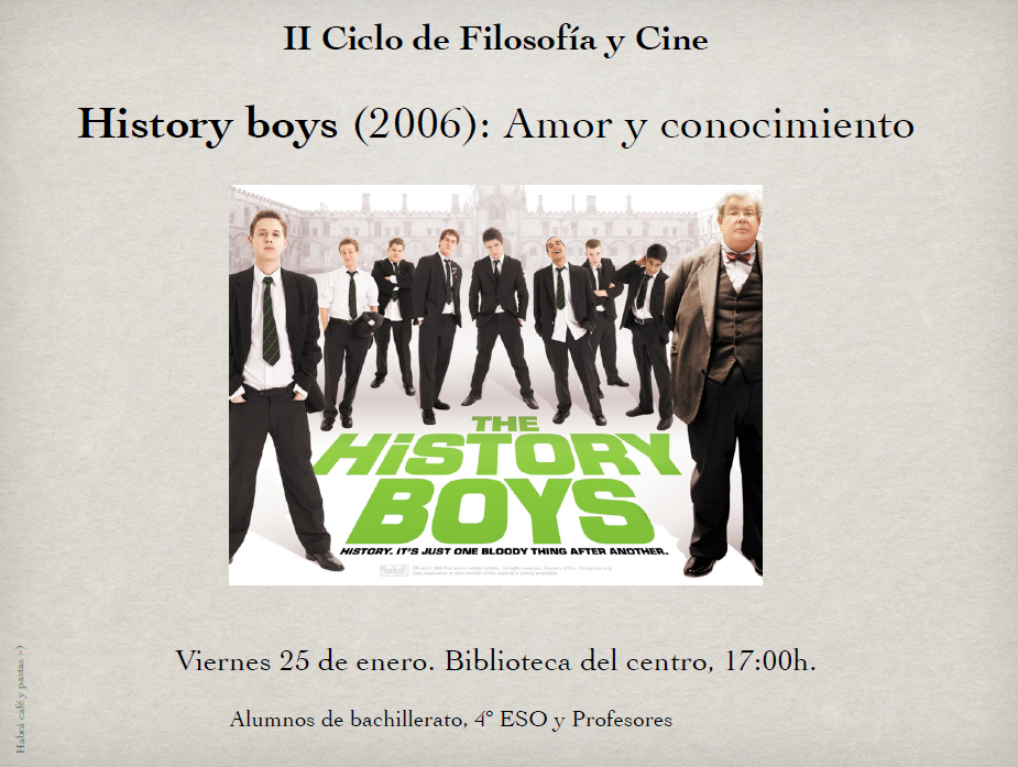 El viernes 25 de enero de 2013 a las 17.00 el Departamento de Filosofía del IES Valle del Jerte proyectará en la biblioteca del centro la película The History Boys (Hytner, 2006). A continuación, como es habitual, tendremos un pequeño debate.