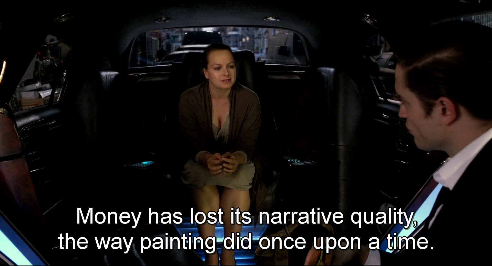 – We want to think about the art of money-making. The greeks have a word for it. Chrimatistikos. But we have to give the word a little leeway. Adapt it to the current situation. Because money has taken a turn. All wealth has become wealth for its own sake. There’s no other kind of enormous wealth. Money has lost its narrative quality, the way painting did once upon a time. Money is talking to itself. I want this car, which I love. The glow of the screens. I love the screens. The glow of cyber-capital. So radiant and seductive.I understand none of this. Does it ever stop? Does it slow down? Of course not. Why should it? It’s fantastic. But you know how shameless I am in the presence of anything that calls itself an idea. The idea is time. Living in the future. Look at those numbers running. Money makes time. It used to be the other way around. Clock time accelerated the rise of the capitalism. People stopped thinking about eternity and began to concentrate on hours. Measurable hours, man hours, using labor more efficiently. It’s cyber-capital that created the future. What is the measurement called a nanosecond?