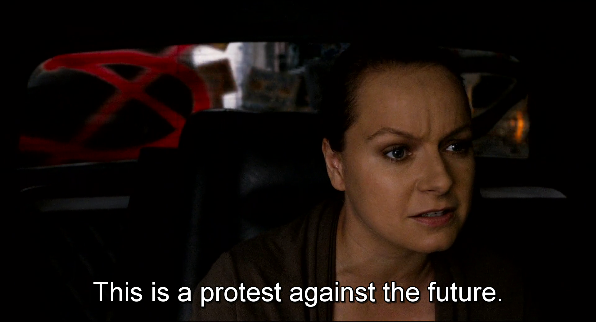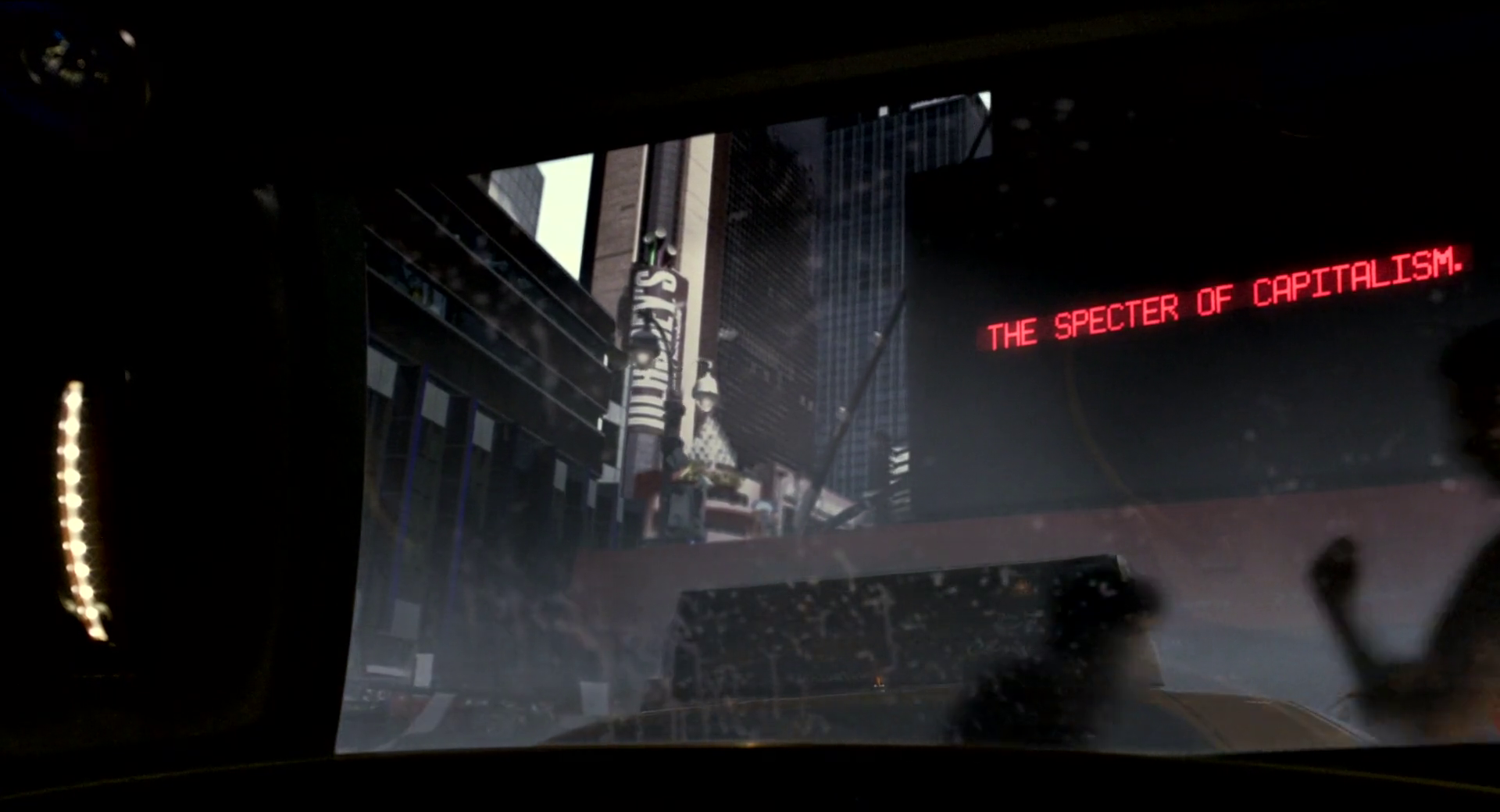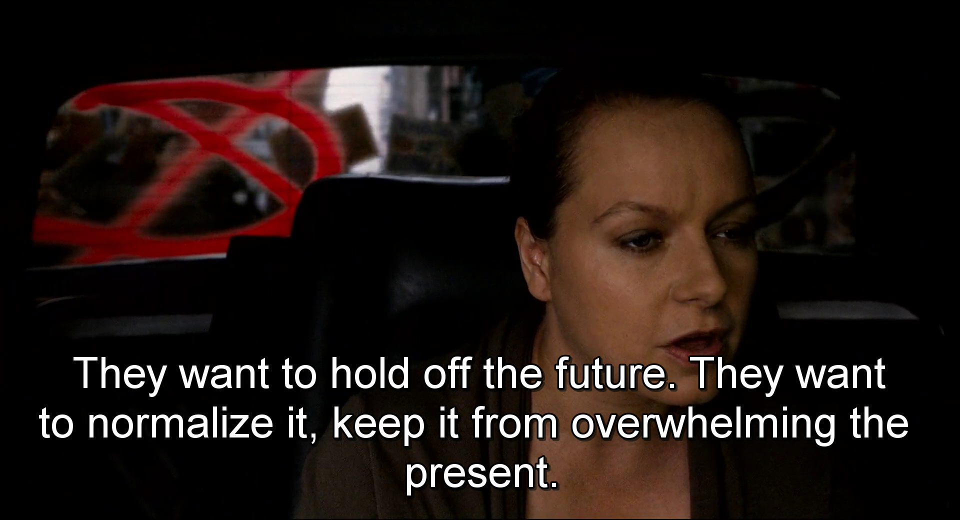 – It pretends not to see the horror and death at the end of the scheme it builds. This is a protest against the future. They want to hold off the future. They want to normalize it, keep it from overwhelming the present. The future is always a wholeness, a sameness, we’re all tall and happy there. This is why the future fails. It can never be the cruel happy place we want to make it. What would happen if they’d knew the head of Packer Capital was in the car? We know what the anarchist have always said.