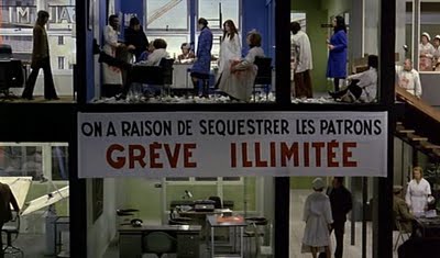 Hace cuarenta años que Godard estrenó Tout va bien.Tras el fracaso de mayo del 68 se impone la idea paradójica de que todo va bien cuando, en realidad, nada ha cambiado. Todos los sueños e ideales del 68 se han desvanecido, la economía ha devorado a la política y el capitalismo campa a sus anchas. Godard, usando la técnica del distanciamiento de Brecht, pone en escena el vacío de todos los discursos políticos, el, así llamado, fin de todas las ideologías. Observa cómo utiliza la sección vertical en el fotograma de arriba para dar una perspectiva global de todas las relaciones sociales en juego: empresario, sindicalistas y ultraizquierda. También en la onda de Brecht, tratándose de una película protagonizada por dos iconos sexuales de la época (Yves Montand y Jane Fonda) cualquiera esperaría un drama romántico. A Godard le sobran treinta segundos para despachar la historia de amor.