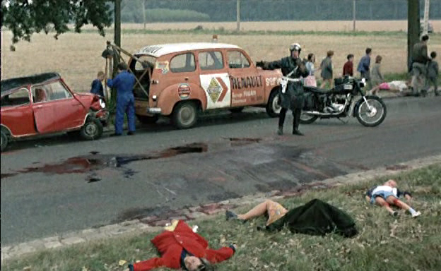 El mayor obstáculo que deben salvar es un gigantesco atasco de tráfico, paradójico símbolo del progreso económico burgués. Godard lo filma en un único plano secuencia de ocho minutos eternos que terminan en un fotograma trágico: en el arcén tres cadáveres de una familia a los que nadie presta atención.