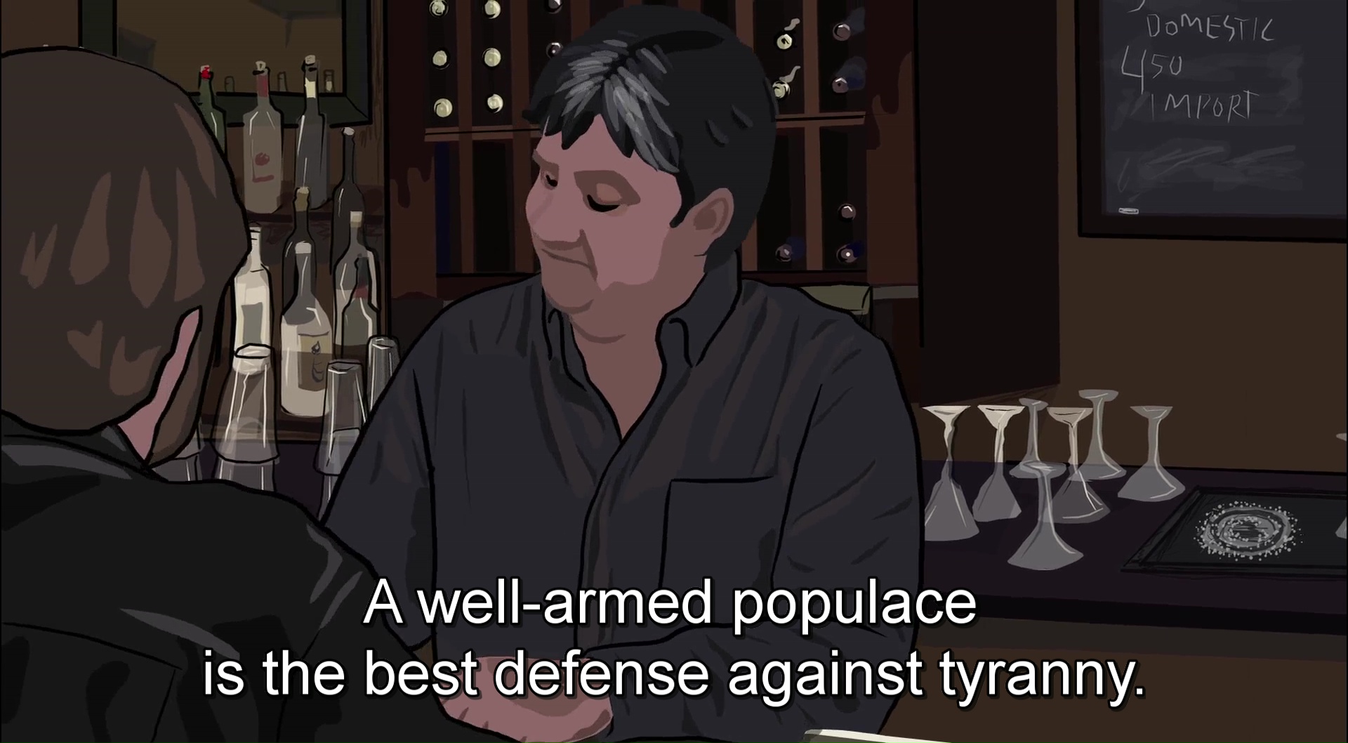 Los actores Steven Prince y Ken Webster interpretan a dos descerebrados que defienden la necesidad de las armas para garantizar la libertad individual.