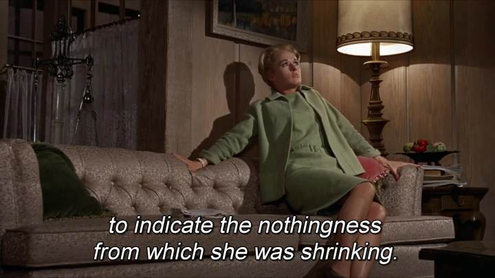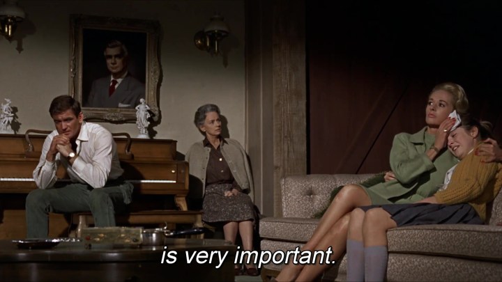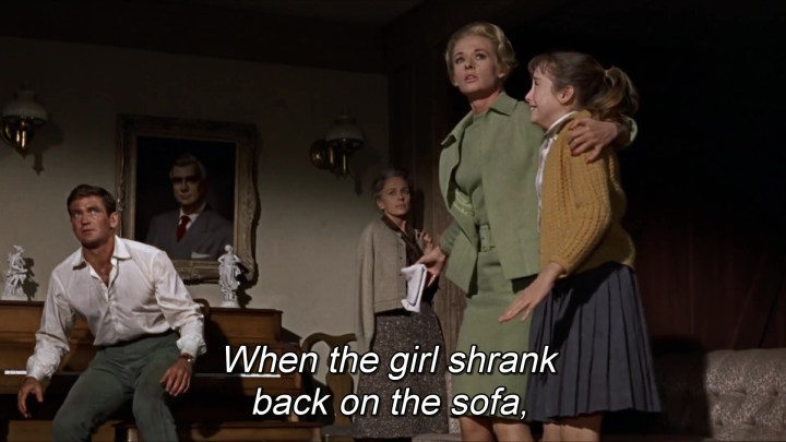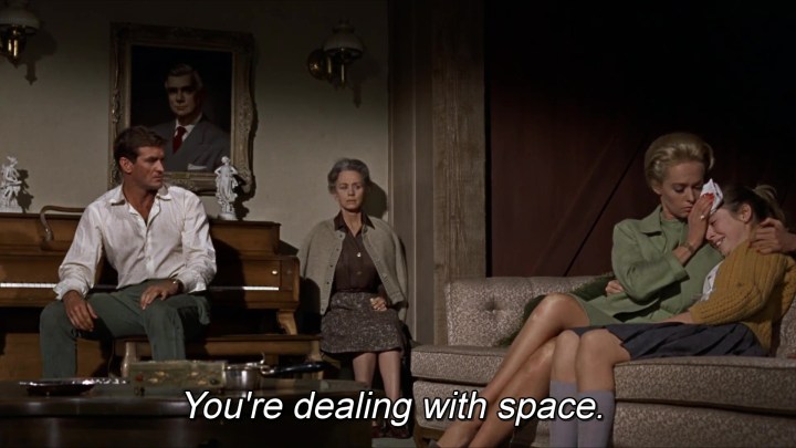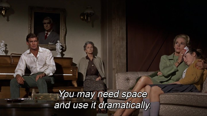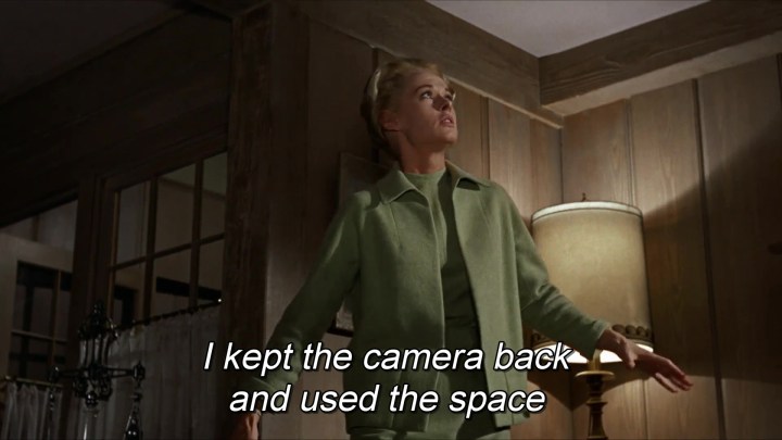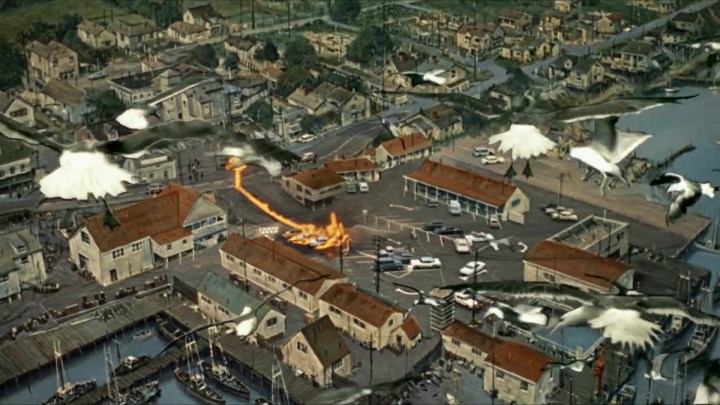 Así, en esta conocida escena de Birds, (1963) donde cualquier director pasaría a primer plano y actriz gritando de miedo, Hitchcock prefiere mantener la cámara atrás para que se perciba la nada que la aterroriza. El mismo uso del espacio en el último fotograma de la serie. Son evidentes las connotaciones teológicas del famoso plano omnisciente del pueblo en llamas.
